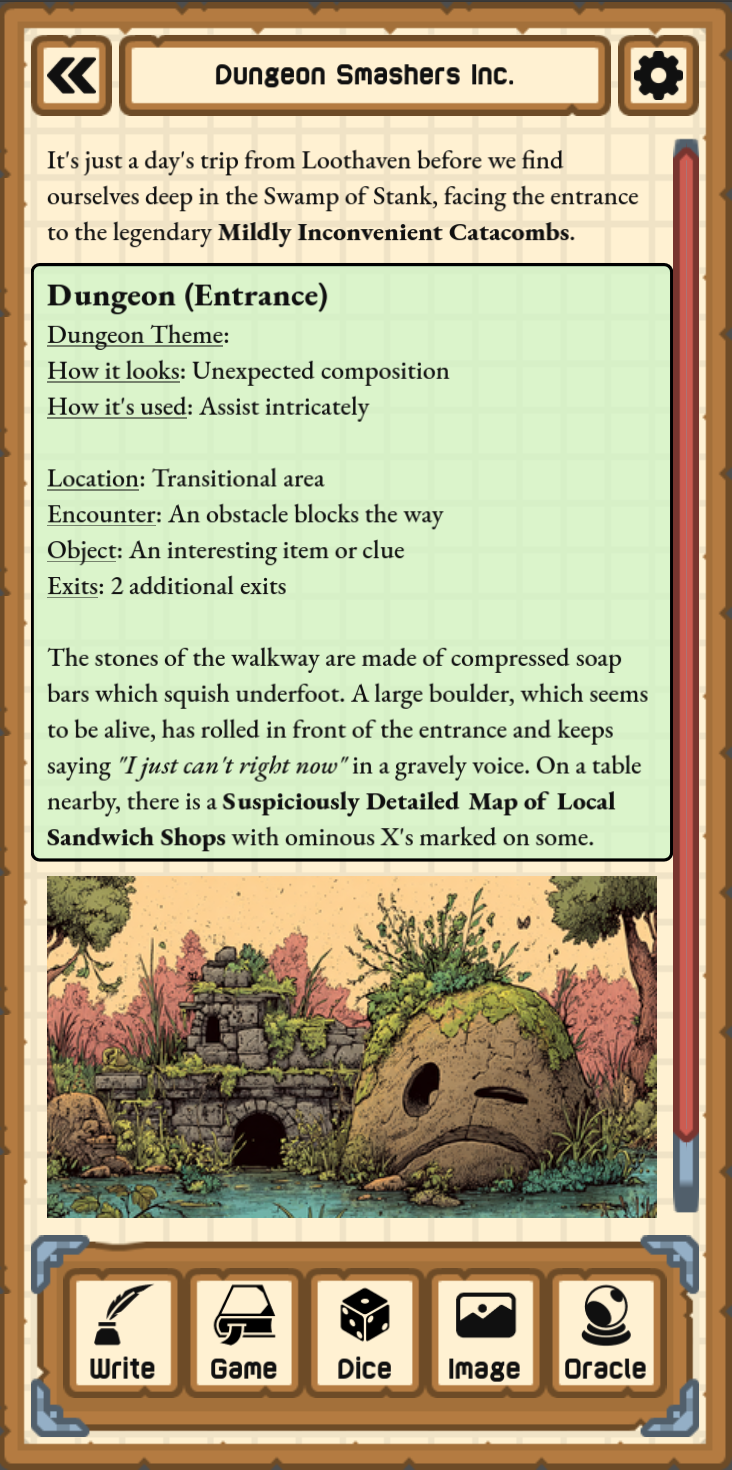As you play, you may need to generate some quests to pursue, NPCs to meet, or dungeons to explore. Use the Generator actions to make new content whenever you need it. The Generic Generator is especially useful since it can give you ideas for magic items, space ships, evil organizations, and just about anything else you can think of.