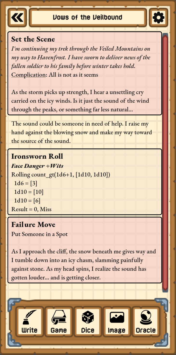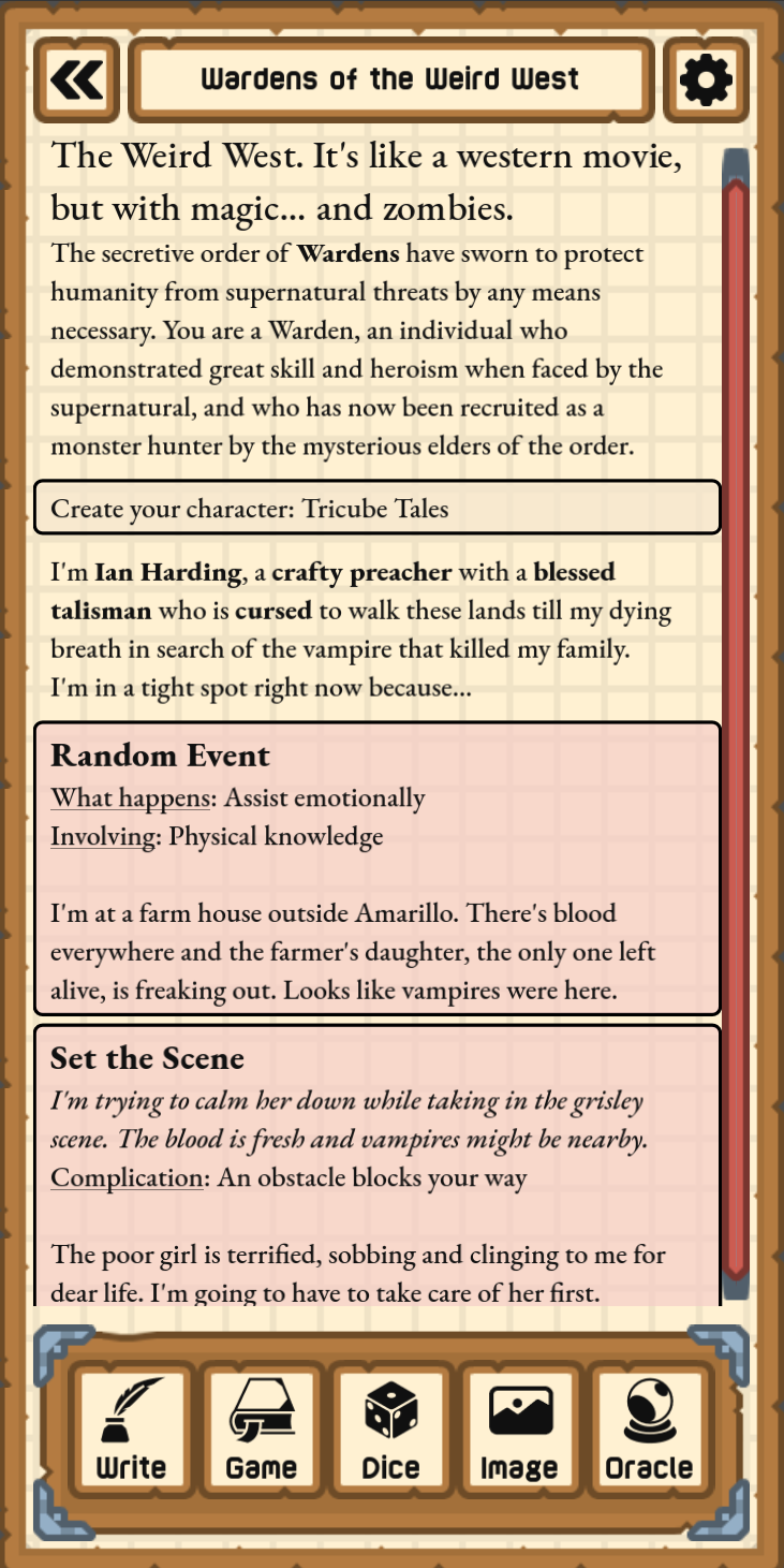 Once you've wrapped up the action for the current scene, envision what your character does next and Set the Scene again. Keep playing like this as long as you want!